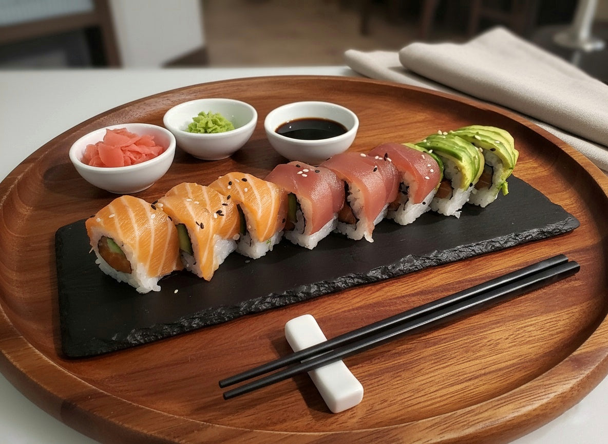 Rouleau avec algue à l’intérieur, recouvert de saumon, de thon et d’avocat. Coloré, frais, et parfait pour ceux qui aiment une variété de saveurs en une seule bouchée.